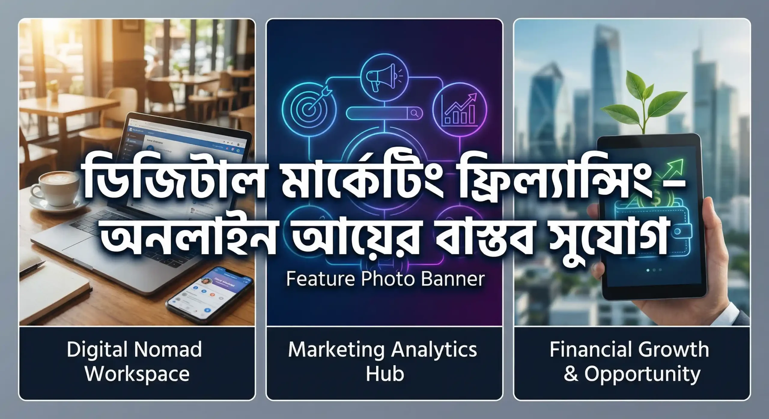 ডিজিটাল মার্কেটিং ফ্রিল্যান্সিং বর্তমান সময়ে অনলাইন আয়ের সবচেয়ে বাস্তব ও কার্যকর একটি মাধ্যম হিসেবে পরিচিত। ডিজিটাল মার্কেটিং ফ্রিল্যান্সিং শুধু ঘরে বসে কাজ করার সুযোগই দেয় না, বরং সঠিক দক্ষতা থাকলে আন্তর্জাতিক ক্লায়েন্টের সঙ্গে কাজ করে নিয়মিত আয় করার পথও তৈরি করে। অনেকেই জানতে চান, এই সেক্টরে আসলে কী ধরনের কাজ থাকে, শুরু করতে কী জানা দরকার, আর ভবিষ্যতে এই কাজ কতটা টেকসই। এই আর্টিকেলটি পড়লে ডিজিটাল মার্কেটিং সম্পর্কিত সেই সব প্রশ্নের বাস্তব ও আপডেটেড উত্তর আপনি এক জায়গায় পাবেন।